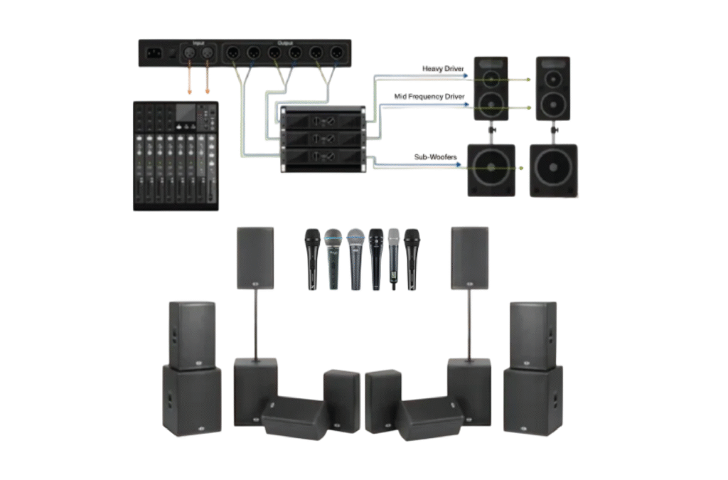 This setup features a complete range of professional-grade audio equipment designed for live events, performances, and permanent PA installations.